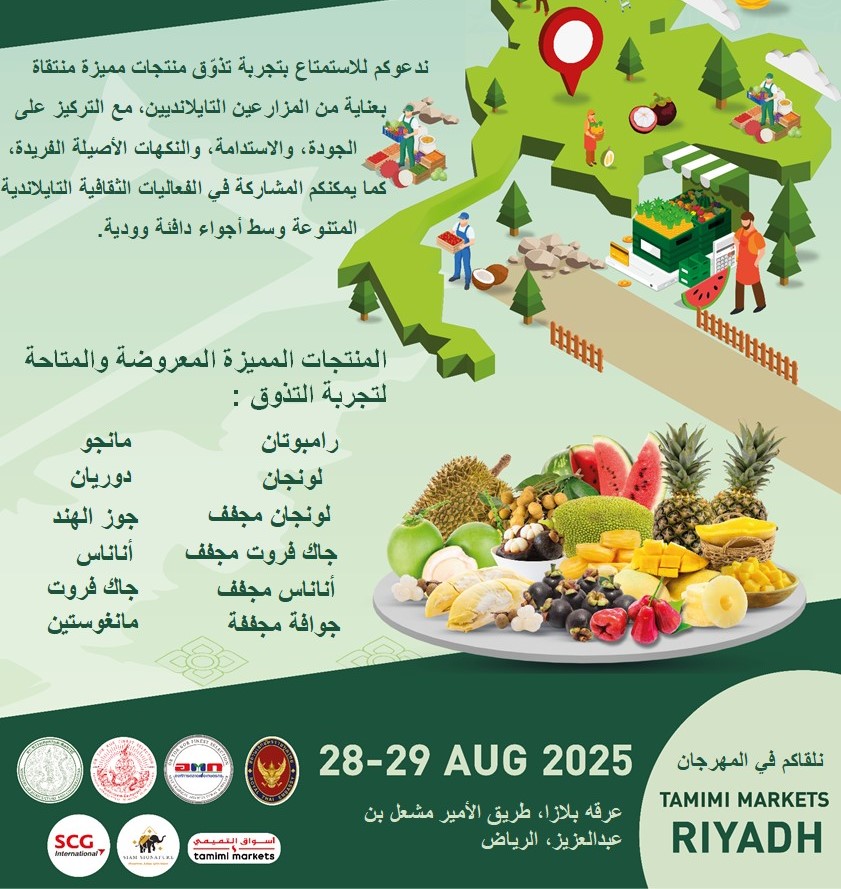BANGKOK, THAILAND - 28 August 2025 - The Marketing Organization for Farmers (Or Tor Kor), under the Ministry of Agriculture and Cooperatives, is taking a major step in expanding Thai agricultural products onto the global stage with the launch of the Riyadh Thai Fruits Festival 2025. The event will be held at Tamimi Store 142 in Riyadh, Kingdom of Saudi Arabia, from 28-29 August 2025. This marks the first time that Thailand is officially showcasing a wide range of premium agricultural products in the Middle Eastern market.