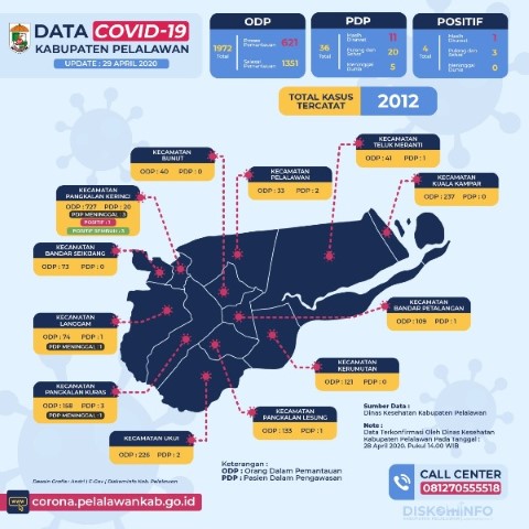 Dia mengatakan berdasarkan data Covid-19 Kabupaten Pelalawan sebagaimana yang di rilis oleh Diskominfo Kabupaten Pelalawan setiap harinya, untuk tanggal 29 April 2020 total kasus Covid-19 di Pelalawan berjumlah 2012 kasus. Untuk ODP sebanyak 1972 orang, dimana 621 orang masih dalam proses pemantauan dan 1351 orang sudah selesai pemantauan.