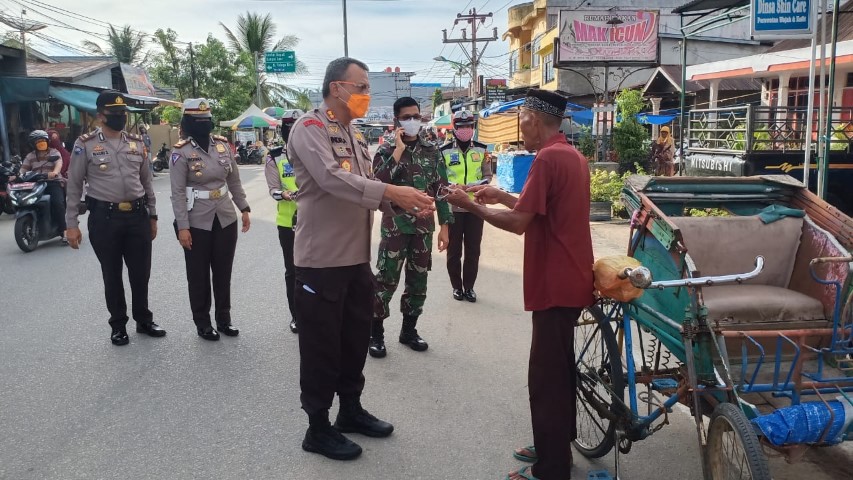 Kapolres dan Dandim 0314/Inhil menyisir hampir sepanjang jalan M. Boya, Tembilahan. Mereka memberikan teguran sekaligus pengarahan kepada setiap pengguna jalan dan pedagang yang tidak menggunakan masker.