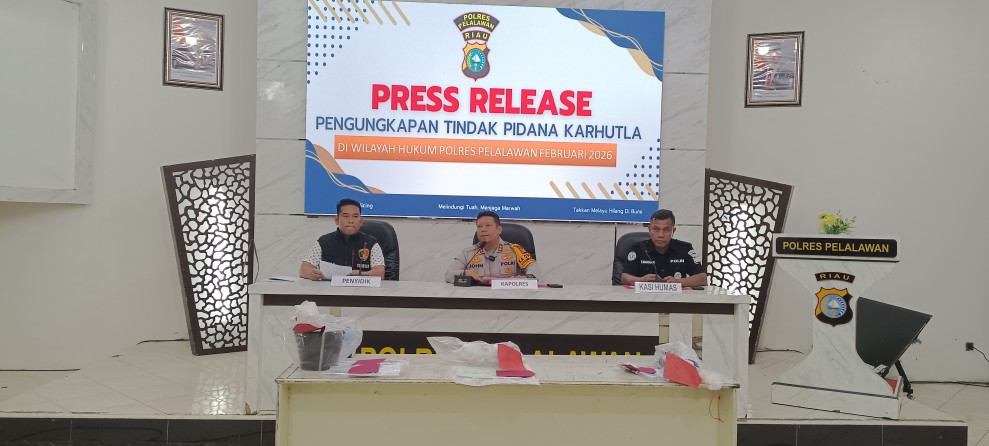 PELALAWAN,INDOVIZKA.COM– Polres Pelalawan kembali menunjukkan komitmennya dalam penegakan hukum terhadap pelaku kebakaran hutan dan lahan (karhutla).Rabu(11/2/2026),Dalam press rilis yang disampaikan Kapolres Pelalawan AKBP John Louis Letedara, SIK, polisi berhasil mengungkap tiga kasus karhutla di wilayah Teluk Meranti dan Kuala Kampar dengan mengamankan empat orang tersangka.