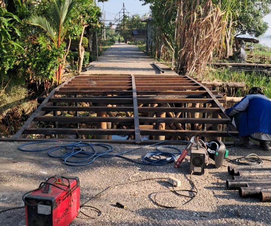 Fokus pekerjaan hari ini meliputi pemasangan besi rangka utama jembatan serta pembersihan area sekitar lokasi pembangunan. Sejumlah peralatan pendukung seperti mesin genset, mesin las, pemotong besi, dan gerinda digunakan untuk menunjang proses pengerjaan.