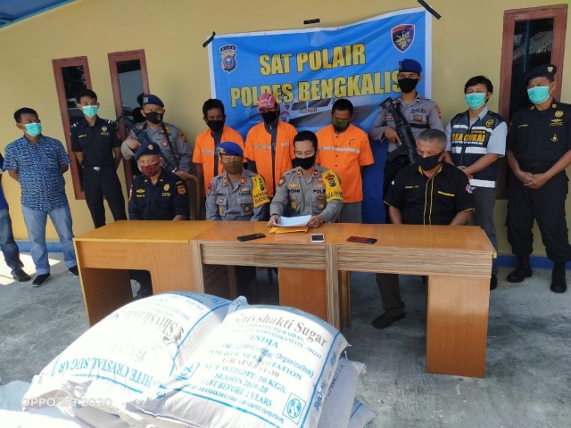 Wakapolres Bengkalis, Kompol Roni Syahendra didampingi Kasatpol Air AKP Rahmat Hidayat saat press release menyampaikan, KM. Salimi yang membawa 600 karung gula pasir itu ditangkap oleh Kapal patroli IV dengan nomor lambung 2303 dan Patroli Bea Cukai Bengkalis dan Bea cukai Tanjung Balai Karimun dengan Kapal lambung BC 8005.