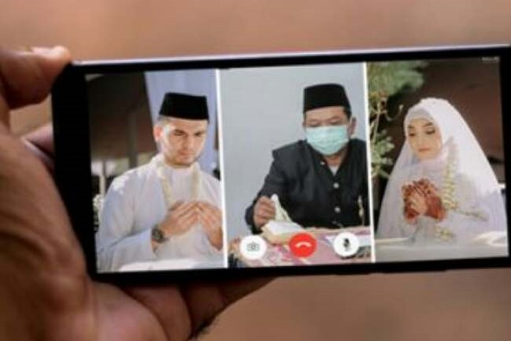 Sejumlah foto yang viral di media sosial, ada yang menunjukkan pernikahan digelar lewat Zoom. Namun terlihat petugas melakukan akad nikah secara langsung di hadapan mempelai.