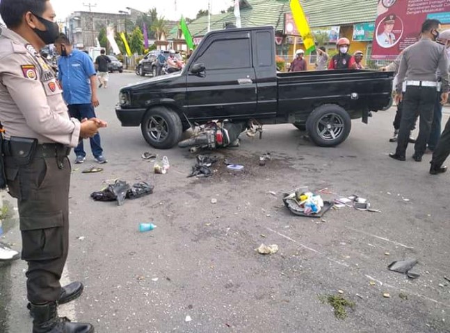 Belum diketahui identitas dari pengendara motor dan mobil jenis Pic Up tersebut.