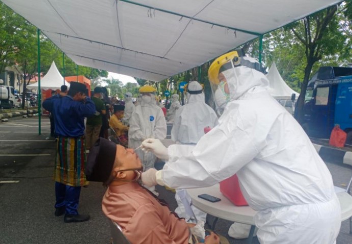 PEKANBARU - Pemerintah Provinsi (Pemprov) Riau melakukan swab massal bagi Aparatur Sipil Negara (ASN) dan Tenaga Harian Lepas (THL) di lingkungan pemerintah setempat, di halaman parkir kantor Gubernur Riau.