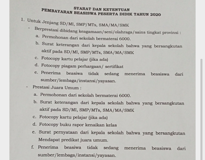 "Sehubungan dengan kegiatan pemberian bantuan beasiswa berprestasi peserta didik di kabupaten Indragiri Hilir (Inhil) tahun anggaran 2020, bersama ini kami mohon kepada saudara agar menyampaikan kepada siswa atau mahasiswa untuk mengajukan beasiswa berprestasi," tulisnya.