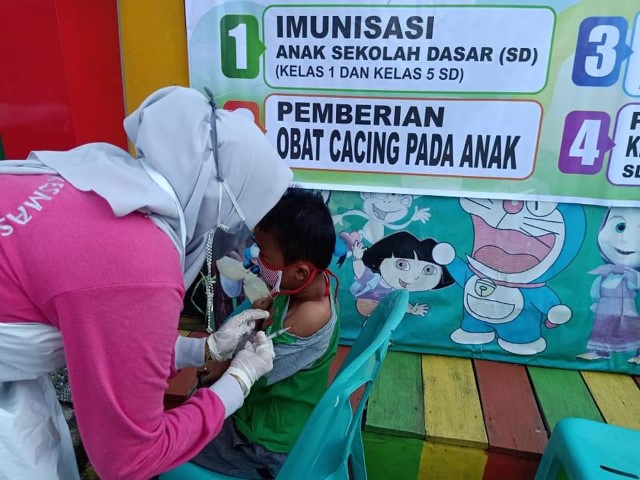 lanjutnya, kami juga meberikan pelayanan imunisisi pada anak SD kelas 1 dan kelas 5, pemberian obat cacing pada anak usia 1 - 12 tahun yang bertujuan untuk mencegah anak-anak mengalami penyakit cacingan.