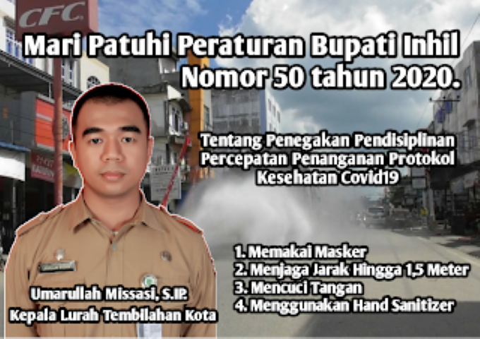 Dengan tingginya total pasien positif covid19, Kepala Kantor Lurah Tembilahan meminta kepada seluruh elemen terutama masyarakat Kelurahan bahkan para pendatang untuk terus mematuhi protokol kesehatan Covid19 yang telah dikeluarkan oleh Bupati Inhil.