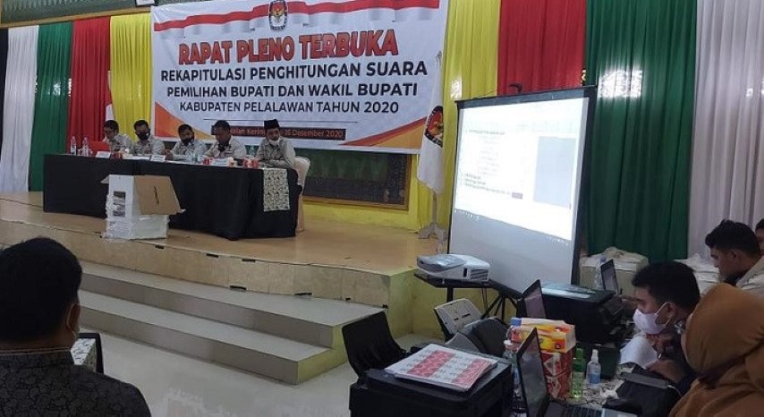 PELALAWAN (INDOVIZKA) - Komisi Pemilihan Umum (KPU) Kabupaten Pelalawan menyelesaikan rapat pleno rekapitulasi perhitungan suara Pemilihan Kepala Daerah tahun 2020, Rabu (16/12/2020) dini hari.