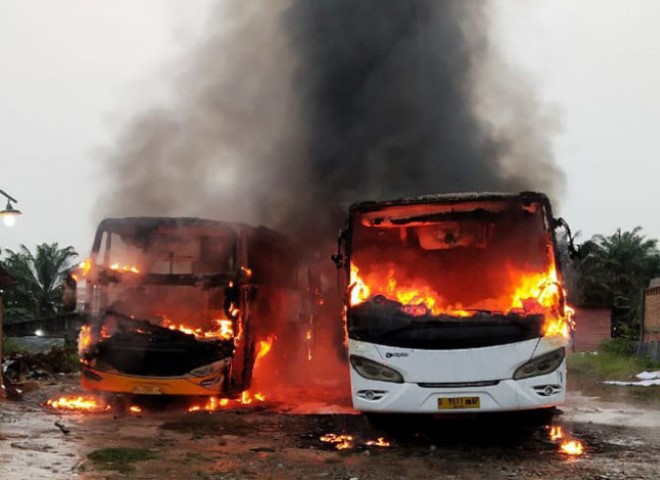 PEKANBARU (INDOVIZKA) - Dua unit mobil bus dengan nomor polisi BL 7790 A dan D 7611 AF terbakar di Jalan SM Amin, Kecamatan Tampan, Pekanbaru pada Sabtu (9/1/2021) pukul 06.00 WIB.