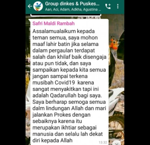 Bahkan, 3 hari sebelum berpulang, Almarhum sempat mengirimkan pesan di grup WhatsApp Dinas Kesehatan yang intinya mengingatkan kepada rekannya agar tidak terkena Covid-19.