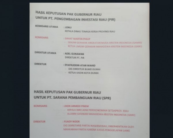 PEKANBARU (INDOVIZKA) - Beredar nama-nama calon komisaris dan direksi dua Badan Usaha Milik Daerah (BUMD) Riau, yakni PT Sarana Pembangunan Riau (SPR) dan PT Pembangunan Investasi Riau (PIR) berdasarkan keputusan Gubernur Riau, Syamsuar.