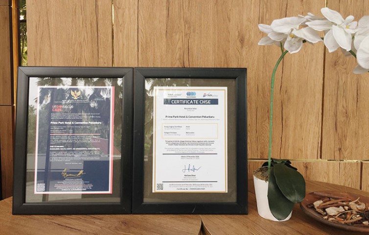 PEKANBARU (INDOVIZKA) - PRIME PARK Hotel & Convention Pekanbaru telah mendapatkan sertifikasi Clean, Healthy, Safety and Environment (CHSE) dari Kementerian Pariwisata dan Ekonomi Kreatif (Kemenparekraf).