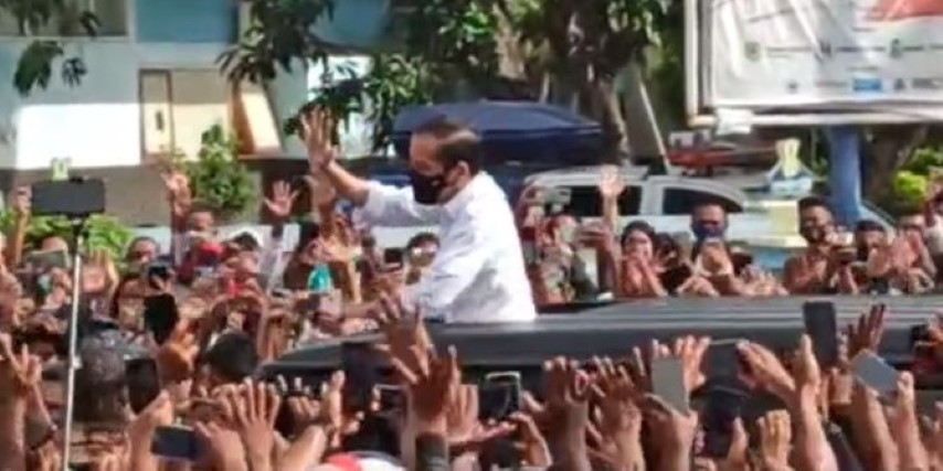 Kemudian, tampak Jokowi yang mengenakan kemeja putih bermasker tersebut melambaikan tangan dari atas mobil kepada masyarakat. Sontak masyarakat pun semakin antusias dan beberapa diantaranya berteriak.
