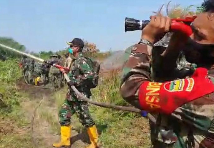 Dandim 0321/Rohil Letkol Arh Agung Rakhman Wahyudi bersama Kapolres Rohil AKBP Nurhadi Ismanto serta personel secara langsung turun ke lokasi dan berjibaku melakukan pemadaman di Kecamatan Pasir Limau Kapas (Palika), Selasa (2/3/2021).