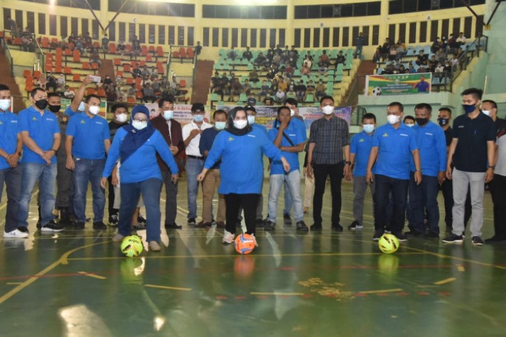 BENGKALIS (INDOVIZKA) - Bupati Bengkalis Kasmarni dan Kepala Kejaksaan Negeri (Kajari) Bengkalis Nanik Kushartanti resmi membuka Open Turnamen Futsal Forwari Cup (OTFFC) II tahun 2021, Selasa (9/3/2021) malam.