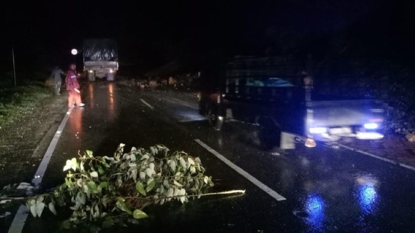 Hujan yang masih berlangsung menyebabkan material jatuh ke jalan.