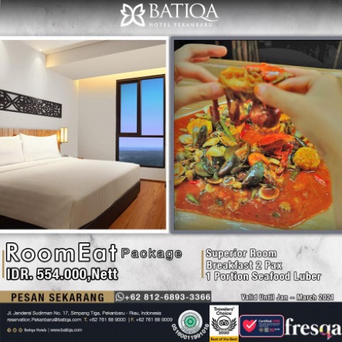 Erlinda, selaku Sales and Marketing Manager Batiqa Hotel Pekanbaru mengatakan untuk promo RoomEat Package ini, Batiqa Hotel Pekanbaru memberikan harga kamar yang menarik. Cukup dengan merogoh kocek sebesar Rp554 ribu untuk tipe kamar superior, para tamu sudah mendapatkan pelayanan yang memanjakan.