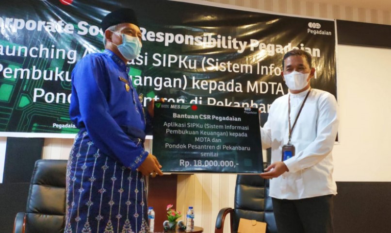 PEKANBARU (INDOVIZKA) - PT Pegadaian (Persero) Kantor Wilayah (Kanwil) II Pekanbaru menyerahkan bantuan program Corporate Sosial Responsibility (CSR) berupa aplikasi SIPKu (Sistem Info Pembukuan Keuangan) kepada Madrasah Diniyah Takmiliyah Awaliyah (MDTA) dan Pondok Pesantren yang ada di Pekanbaru, Jumat (26/3/2021).