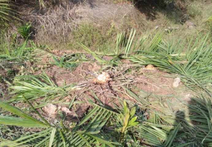 Di lokasi tanaman kebun kelapa sawit ini, ditemukan pula bekas kotoran hewan yang dilindungi undang-undang, berserakan di berbagai titik. Tidak itu saja, pokok kelapa sawit yang dirusak juga ditemukan di berbagai titik.