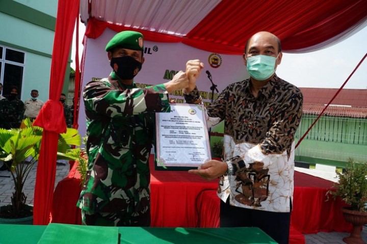 PEKANBARU (INDOVIZKA) - Komando Resor Militer (Korem) 031/Wira Bima menerima hibah berupa satu unit bangunan Wisma dua lantai beserta kelengkapannya dari PT Riau Andalan Pulp and Paper (RAPP).