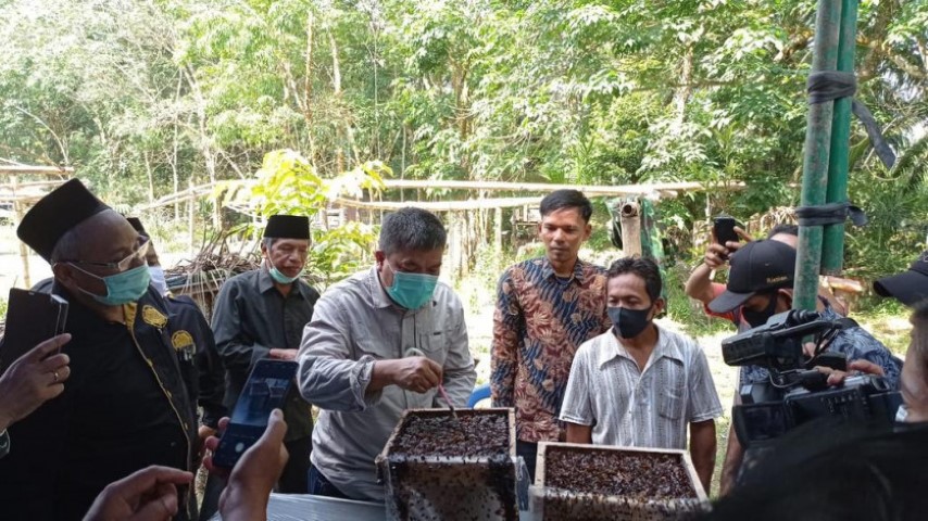 PEKANBARU (INDOVIZKA) - Kepala Dinas Lingkungan Hidup dan Kehutanan (DLHK) Provinsi Riau, Mamun Murod panen Madu Kelulut yang ditangkarkan oleh Kelompok Usaha Perhutanan Sosial (KUPS) Kenegerian Kampa, Kabupaten Kampar, Sabtu (10/4/2021).