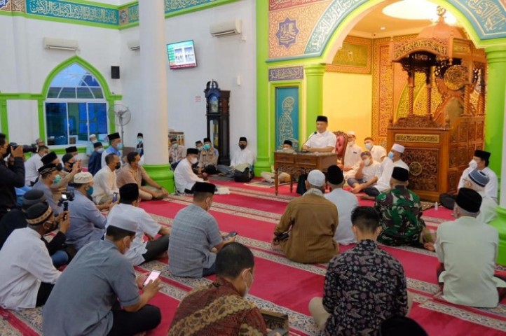 KAMPAR (INDOVIZKA) - Kapolda Riau Irjen Pol Agung Setya Imam Effendi melaksanakan tarawih bersama masyarakat di Masjid Ittihadul Ummah, Jalan Kopkar Raya, Desa Pandau Jaya, Kecamatan Siak Hulu, Kabupaten Kampar, Selasa (13/4/2021) malam.