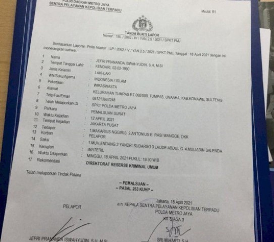 JAKARTA (INDOVIZKA) - Sebanyak 9 orang pengacara dari Partai Demokrat kubu Moeldoko, resmi dipolisikan atas pidana pemalsuan surat dan tanda tangan dari Ketua DPC Demokrat Konawe Utara, Jefri Prananda Iswahyudin ke Polda Metro Jaya. Akibatnya para pengacara aktif itu kini terancam pidana 6 tahun kurungan penjara.