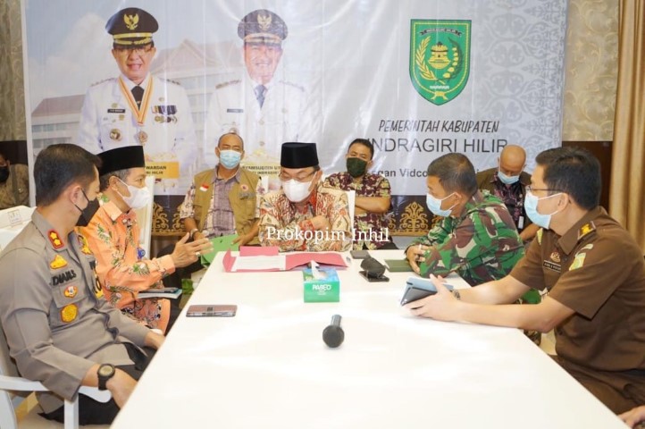 TEMBILAHAN (INDOVIZKA)- Bupati Indragiri Hilir HM. Wardan didampingi unsur Forkopimda mengikuti secara virtual Rapat Kordinasi Penanganan Covid 19 dan Mitigasi Bencana di Prov. Riau yang dihadiri kepala BNPB RI dari ruang multimedia Diskominfopersantik Kabupaten Indragiri Hilir, Kompleks Kantor Bupati Jl. Akasia No. 1 Tembilahan, Kamis (22/4/2021).