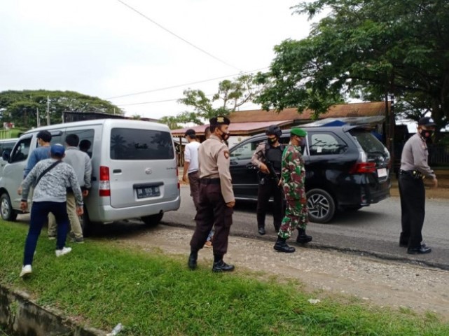 Inhu (INDOVIZKA) - Polsek Pasir Penyu dan Tim Gabungan TNI dari Koramil Air Molek serta anggota Satpol PP Inhu, menghentikan dan memeriksa semua kendaraan yang melintas di ruas jalan raya Jenderal Sudirman Kelurahan Air Molek II guna antisipasi aksi terorisme, Sabtu (24/4/2021).