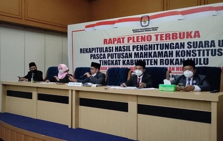 ROHUL (INDOVIZKA) - Komisi Pemilihan Umum (KPU) Kabupaten Rokan Hulu menggelar Rapat Pleno Terbuka Rekapitulasi Perhitungan Suara Ulang Pasca Putusan Mahkamah Konstitusi, Sabtu (24/4/2021), di Convention Hall Masjid Agung Islamic Center Rohul.