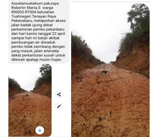 "Dekat perkantoran Tenayan Raya sejak Kamis 22 April banjir akibat pembuangan air waduk tidak seimbang dengan yang masuk. Jalan alternatif dekat perkantoran susah untuk dilewati apalagi musim hujan," kata Roberlin, Selasa (27/4/2021).