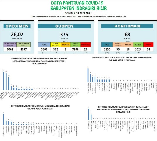 Tambahnya, dr. Saut menyebut bahwa hari ini juga terdapat 1 orang pasien meninggal dunia domisili Kec.Tembilahan Hulu Wilayah Kerja PKM Tembilahan Hulu pada (03/05/2021) pukul 06.01 WIB.