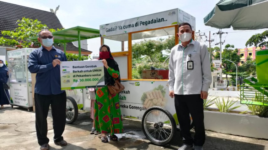 Sementara itu, Pemimpin Wilayah II PT Pegadaian (Persero) Kantor Wilayah Pekanbaru, Maryono mengatakan dengan menggandeng Lembaga Amil Zakat Nasional (Laznas) Dewan Dakwah Provinsi Riau, pihaknya hari ini menyerahkan bantuan Gerobak berkah untuk UMKM yang ada di Pekanbaru.