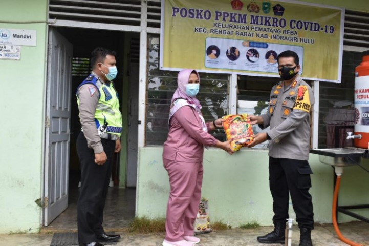 INHU (INDOVIZKA) - Kepala Kepolisian Resor (Kapolres) Indragiri Hulu (Inhu) AKBP Efrizal S.I.K didampingi sejumlah Pejabat Utama Polres Inhu membagikan paket sembako terhadap korban terpapar Covid-19 di beberapa pos Pemberlakuan Pembatasan Kegiatan Masyarakat (PPKM) Mikro Covid-19 Kelurahan Pematang Reba Kecamatan Rengat Barat.