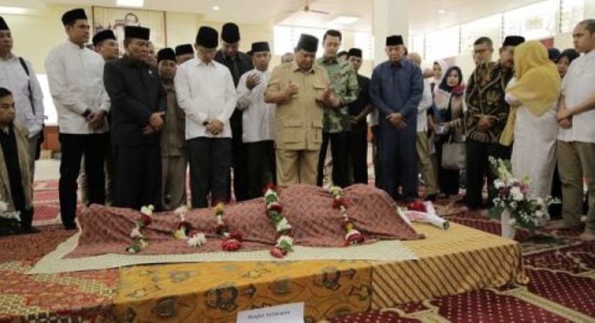 Sekitar pukul 10.30 WIB, Prabowo nampak melakukan salat jenazah dan mendoakan almarhum di depan jenazahnya. Dia kemudian berbincang singkat dengan pihak keluarga dan menyampaikan belasungkawa.
