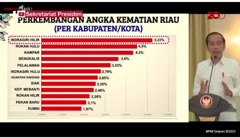 "Angka kematian (pasien Covid, red) kita di Nasional 2,7 (persen), hati-hati Indragiri Hilir," kata Jokowi saat melakukan press conference, video YouTube Sekretariat Presiden, pada Rabu (19/5/2021) di Pekanbaru.