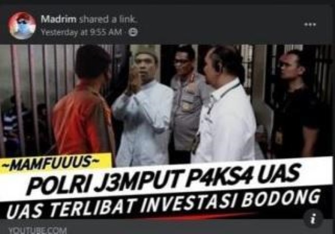 Dilansir dari turnbackhoax.id, setelah melakukan penelurusan, video tersebut tersedia di channel Youtube Suara Inspirasi dengan judul “Berita Terkini ~ Buntut Panjang Investasi Bodong, UAS Terlibat?” dengan thumbnail gambar UAS di sebuah penjara dan tulisan bahwa Polri melakukan penjemputan paksa terhadap UAS perihal investasi bodong.