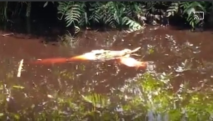 Kali ini buaya yang diperkirakan berukuran 3 meter tersebut terlihat dan terekam kamera sedang memangsa seekor kambing milik Tarom warga RT 02 RW 07 Dusun Cabang Galah Desa Mumpa.