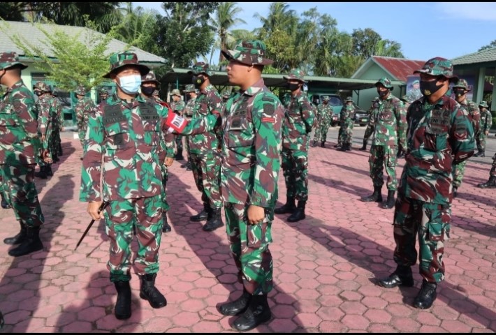 TEMBILAHAN, (INDOVIZKA)- Sebelum melaksanakan upacara pembukaan TMMD ke-111 Kodim 0314/lnhil, terlebih dahulu para personil TNl yang tergabung dalam Satgas TMMD ke-111 melaksanakan apel pengecekan di lapangan Makodim 0314/lnhil, jalan Ahmad Yani, Parit 9, Tembilahan Hulu, Selasa, (15/06/2021).