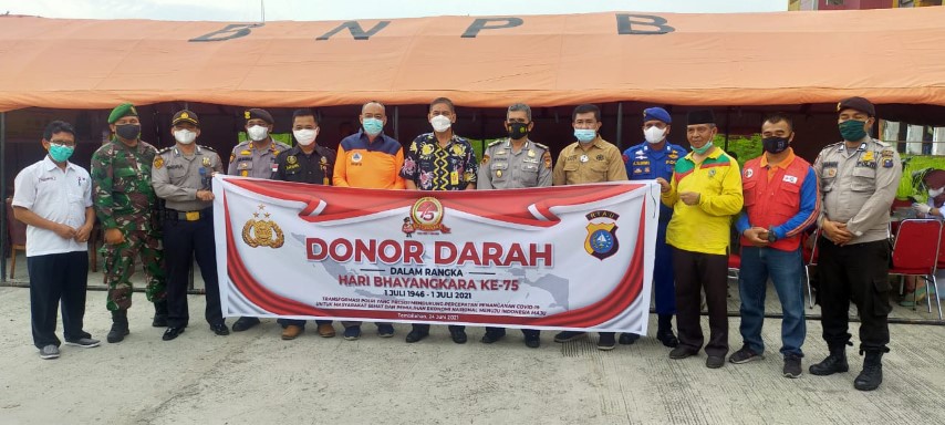TEMBILAHAN, (INDOVIZKA)- Kepolisian Resor Inhil bekerjasama dengan Palang Merah Indonesia (PMI) dan GRANAT Kabupaten Inhil menggelar donor darah massal dalam rangka menyambut hari ulang tahun (HUT) Bhayangkara ke - 75 dan Hari Anti Narkotika Internasional ( HANI ), yang dipusatkan di halaman parkir eks Gedung Unisi Jalan Swarna Bumi Tembilahan, Kamis (24/6/2021).