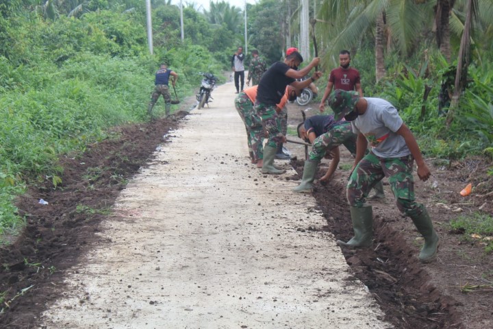 "Selain itu, untuk mengisi kekosongan waktu, satgas TMMD bersama masyarakat melakukan gotong royong penimbunan tepi kanan kiri jalan dengan menggunakan tanah disamping jalan agar jalan terlihat rapi dan tidak membahayakan pengguna jalan nantinya.