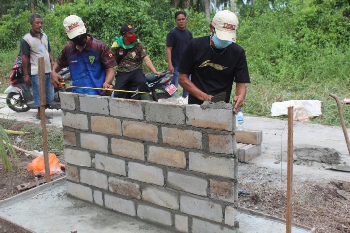 INHIL, (INDOVIZKA) - Jika hari kemarin satgas bersama masyarakat melaksanakan pengecoran untuk membuat dasar tugu prasasti TMMD, hari ini pembuatan tugu mulai dikerjakan dengan memasang batako di perbatasan Desa Terusan Beringin Jaya dengan Desa Teluk Bunian.