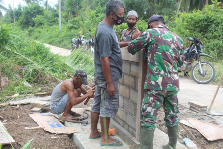 INHIL, (INDOVIZKA) - Tidak hanya masyarakatnya saja yang ikut bergotong royong, Kepala Desa Teluk Bunian hari ini ikut turun tangan dalam pengerjaan pembuatan tugu prasasti TMMD ke 111 Kodim 0314/lnhil. Senin, (05/07/2021).