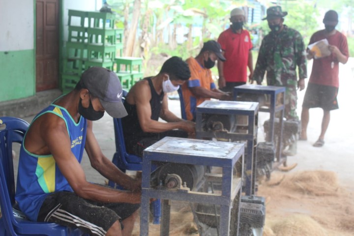 "Hari ini kita lakukan pelatihan kepada masyarakat tentang cara menyerut sabut kelapa. Yang mana dari penyerutan ini akan menghasilkan 3 macam bahan yang semuanya berdaya guna yaitu serabut atau serat, serabut halus dan serbuk sabut," ungkap Dansatgas TMMD ke 111 Kodim 0314/lnhil Letkol lnf lmir Faishal melalui Serka Sugianto