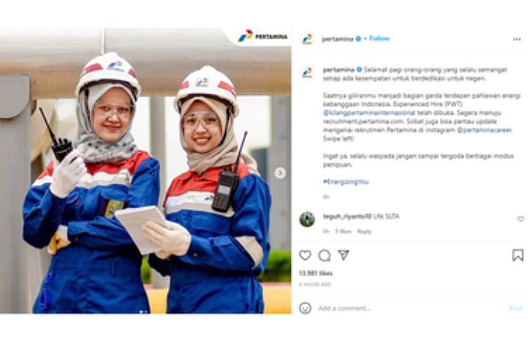 Informasi lowongan Pertamina Group itu juga diinformasikan melalui unggahan akun Instagram resmi Pertamina, @pertamina, Jumat (5/11/2021).