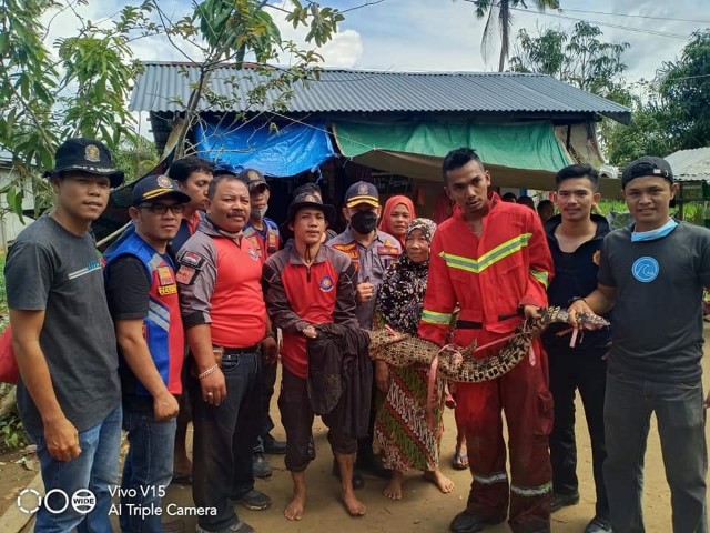 TEMBILAHAN, (INDOVIZKA) Tim Reaksi Cepat Dinas Pemadam Kebakaran dan Penyelamatan Kabupaten Indragiri Hilir berhasil mengevakuasi seekor buaya muara di belakang rumah warga Yolandi di Jl Suhada 2 RT 02 RW 03 Kecamatan Tembilahan Hulu, Minggu (07/11/2021).