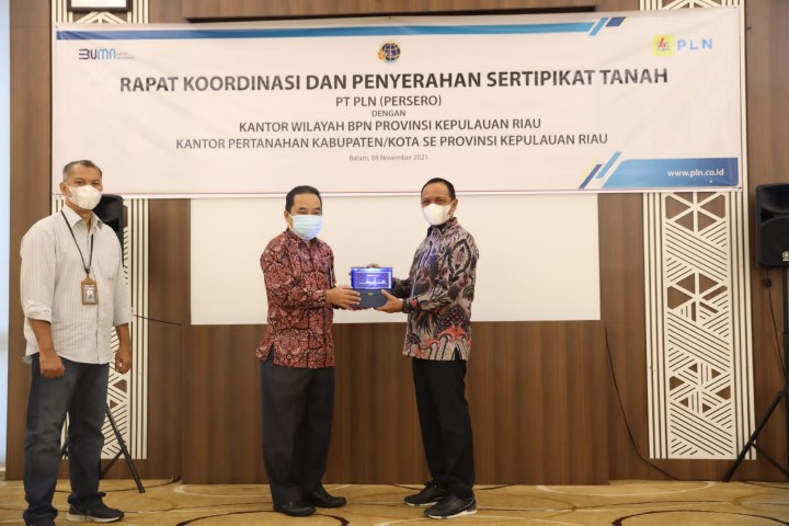 Penyerahan dilakukan oleh Kepala Kantor Wilayah BPN Kepulauan Riau Askani, S.H, M.H. kepada General Manager PLN Unit Induk Wilayah Riau dan Kepulauan Riau, Hartono di Hotel Aston, Batam (08/11/2021).