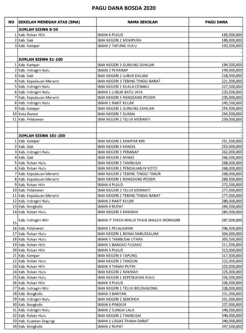 Kepala Dinas Pendidikan (Disdik) Riau, Rudyanto mengatakan, dana Bosda tersebut mengalami kenaikan dibandingkan 2019 sebesar Rp250 miliar. Dengan anggaran itu diharapkan dapat mewujudkan pendidikan gratis tingkat SMA/SMK negeri tahun 2020.