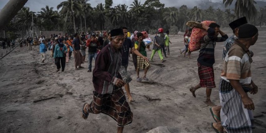 Pada Sabtu (4/12) sore, Gunung Semeru mengeluarkan asap panas dan menimbulkan hujan abu ke daerah di sekitarnya. Warga yang tinggal di perkampungan di sekitar gunung setinggi 3.676 meter di atas permukaan laut itu mengungsi untuk menghindari dampak guguran awan panas.
